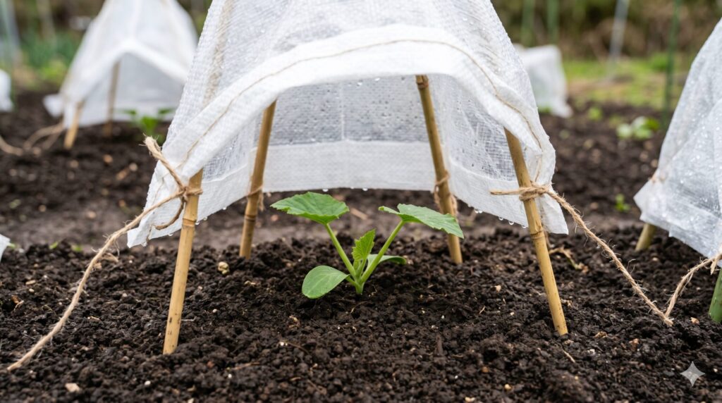 定植直後の苗はまだ弱く、風にあおられるとすぐに茎がダメージを受けてしまいます。そこで役立つのが「あんどん仕立て」です。苗の四隅に短い棒を立てて、肥料の空袋などで囲いを作ってあげましょう。これが風よけになるだけでなく、保温効果や害虫であるウリハムシからのガードにもなります。あんどんの中で苗が安定して育ち、袋の高さを超えるくらいまで大きくなったら、いよいよ本支柱への切り替えです。この初期の丁寧な保護が、その後の爆発的な成長を支えることになります。
